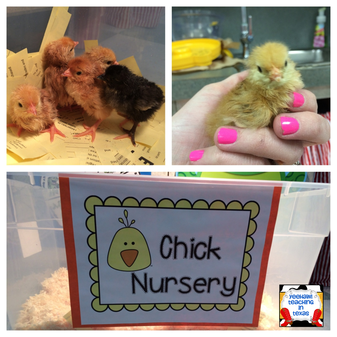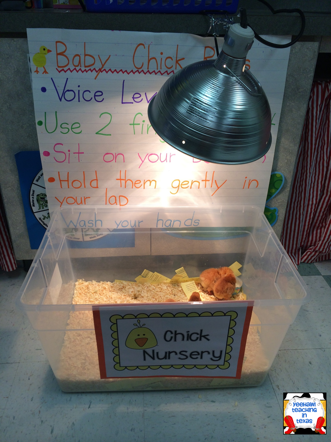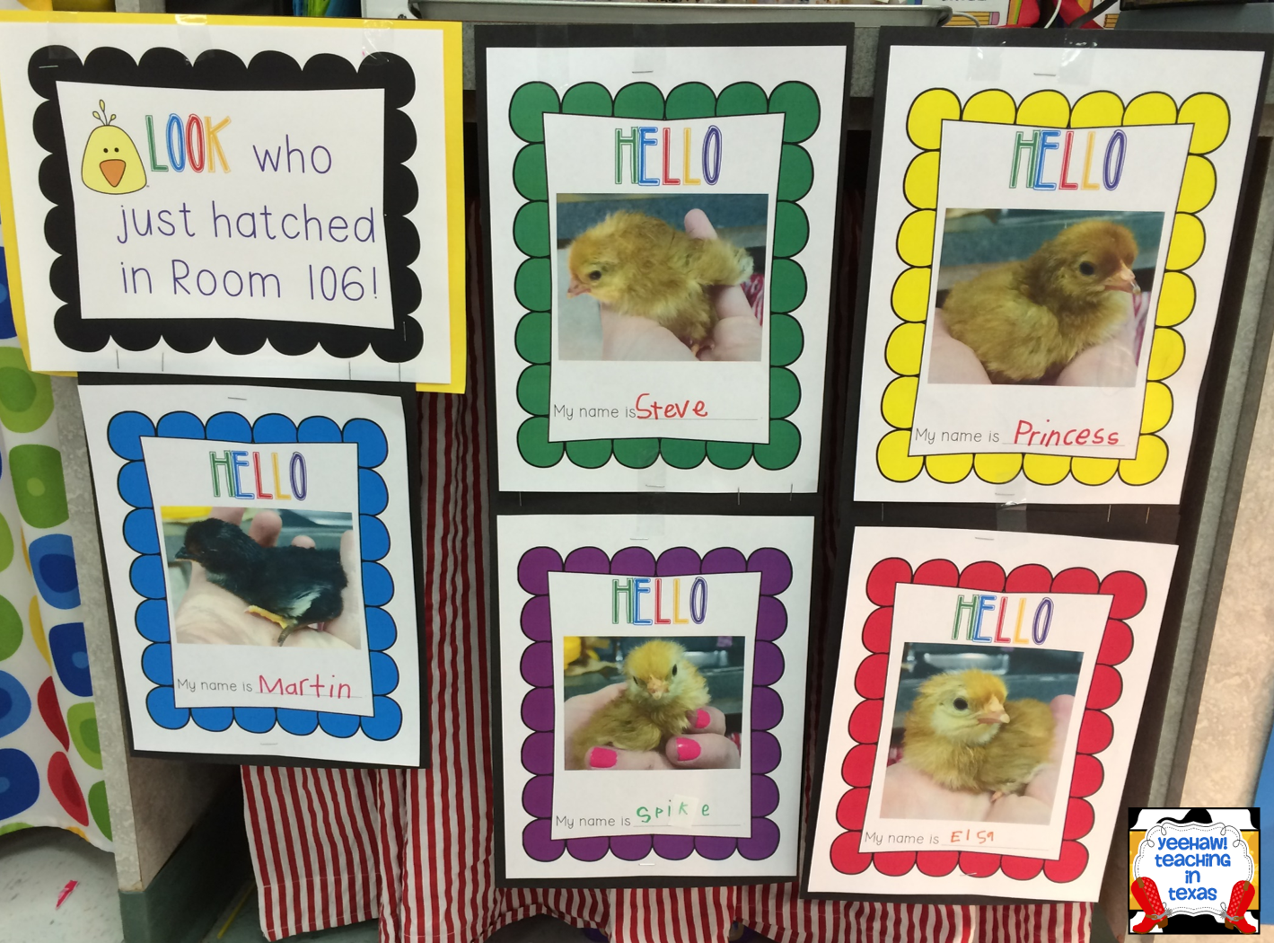 We named all 5 chicks although we can’t really tell them apart : ) Our posters turned out so cute and it was a good reminder lesson about all names starting with an uppercase letter. This set of posters hangs by the chick nursery and I made another set for the hallway. We will have the babies all week and then they will head to the farm!