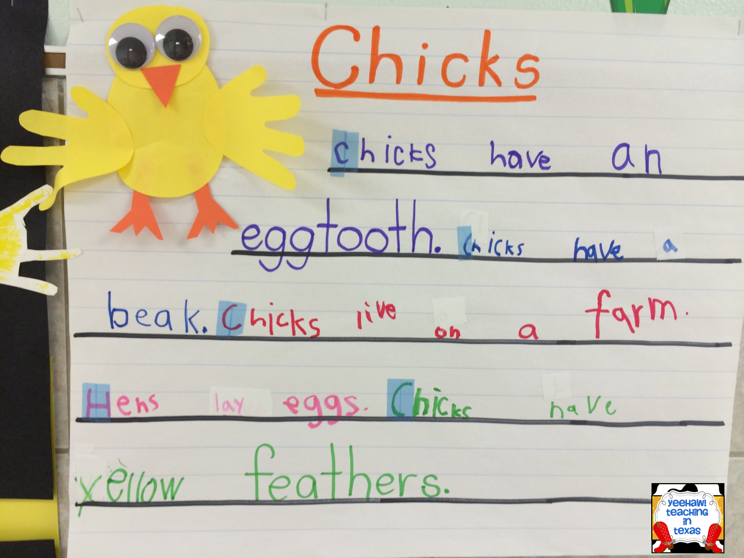 I just love teaching interactive writing! This group of kids has really struggled with using uppercase letters to begin a sentence. So, we have been using highlighter tape so really enforce starting sentences with uppercase letters.