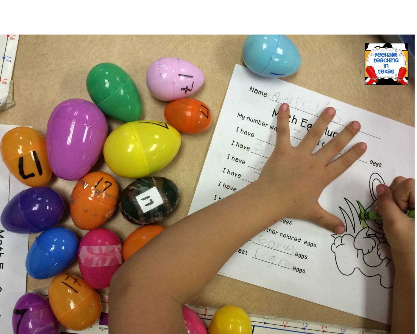 Thursday we had the big Kindergarten Math Easter Egg Hunt. Each child in my class has a number 1-19. The parents sent filled eggs labeled with each number 1-19. So they brought an egg with the number 1 on it, an egg with the number 2 on it, all the way to 19. The students hunted for eggs that were labeled with their number. It was a great way to reinforce number recognition and ensure that everyone got an equal amount of eggs.
