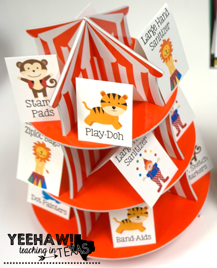 2. Make a wish list! Parents can’t help provide classroom supplies if they don’t know what you need! The beginning of the year is the perfect time to ask parents for what you need for a successful school year. I use this circus cupcake stand (that matches my classroom theme) to display the items I need. Parents just take what item they can donate to the classroom.