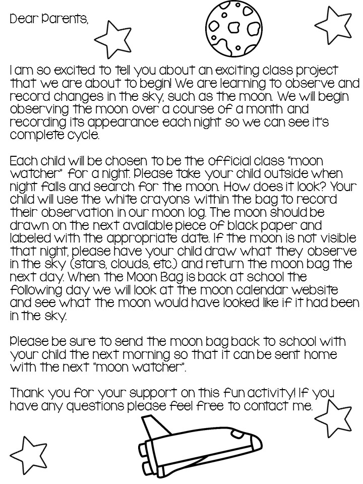 Inside the binder I include a pencil pouch with white crayons, a book about the moon, hole punched black construction paper, and this letter.