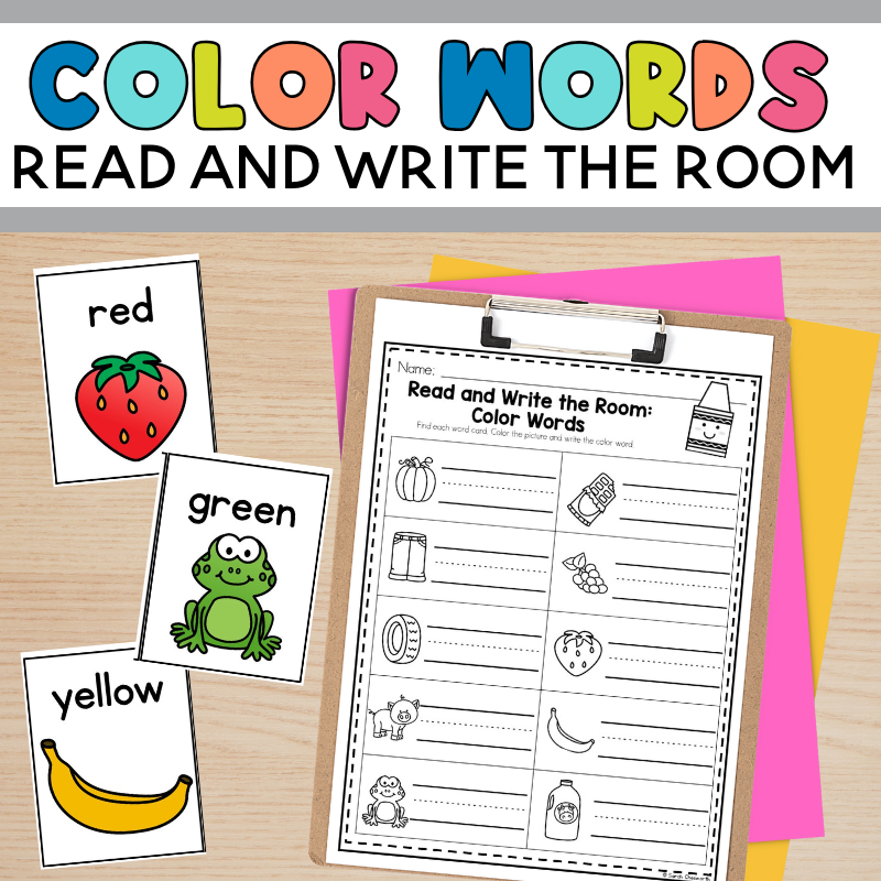 Incorporating color words into your Read and Write the Room routine is a fun and effective way to help kindergarten students learn to read and spell common color words they encounter every day. Post cards around the classroom with color words written in bold, clear print—either in matching colors (e.g., the word “blue” written in blue) or mixed-up colors to encourage true word recognition rather than just color matching.